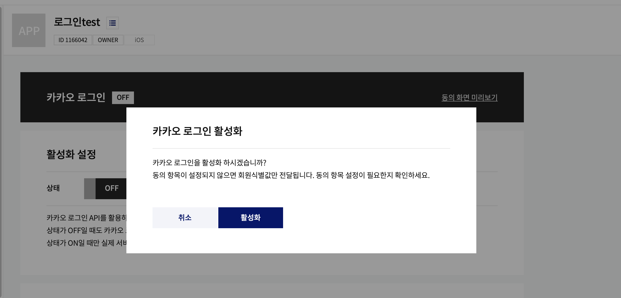 그리고 카카오 로그인 상태를 OFF -> ON으로 해준다.