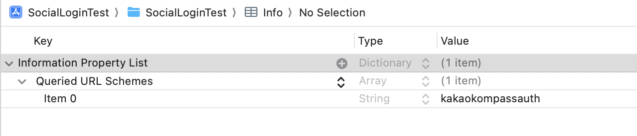 에 가서, LSApplicationQueriesSchemes 라는 새로운 키를 추가해줄것이다.