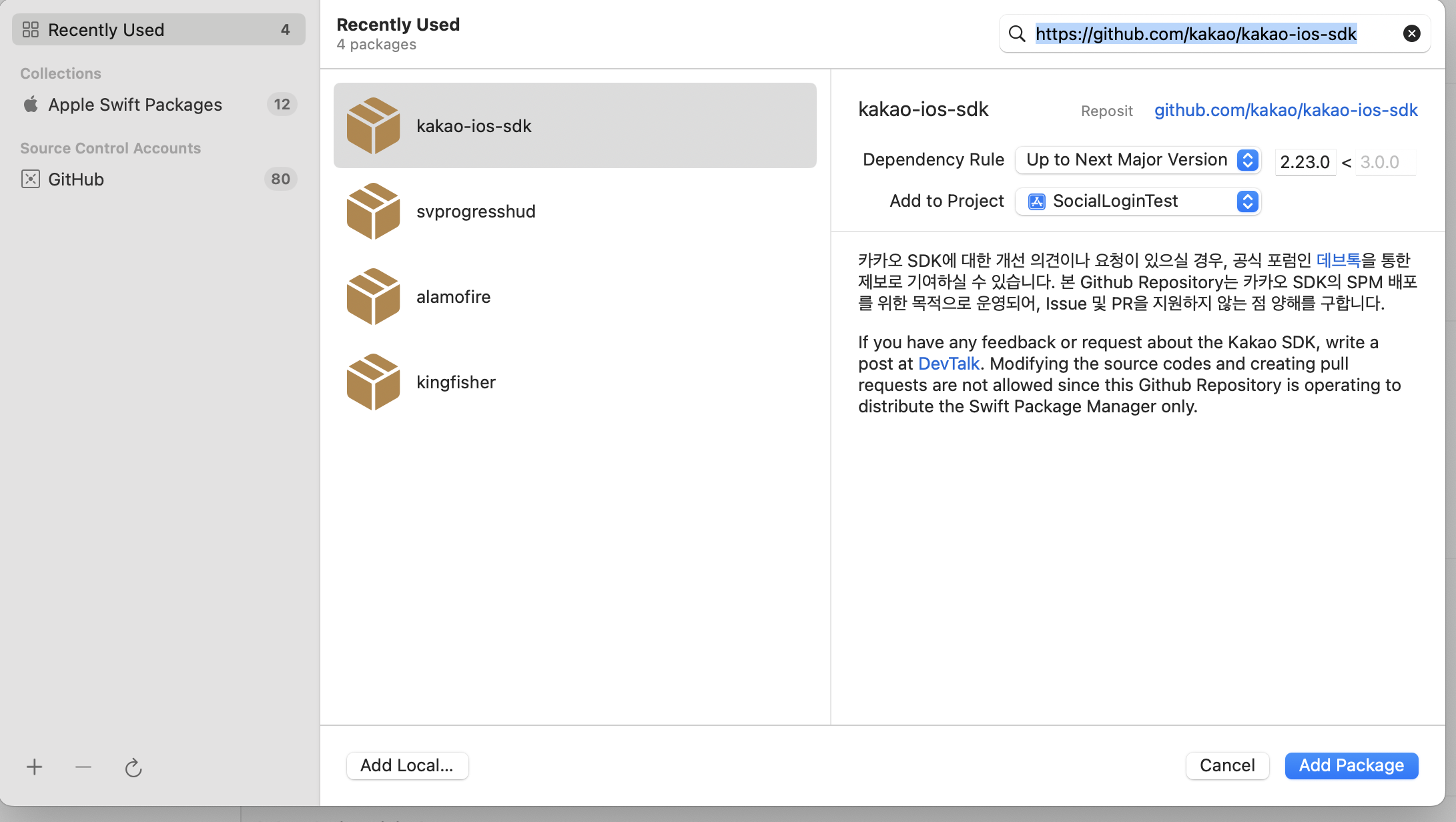 그리고 XCode에 아래 패키지를 추가해준다.
