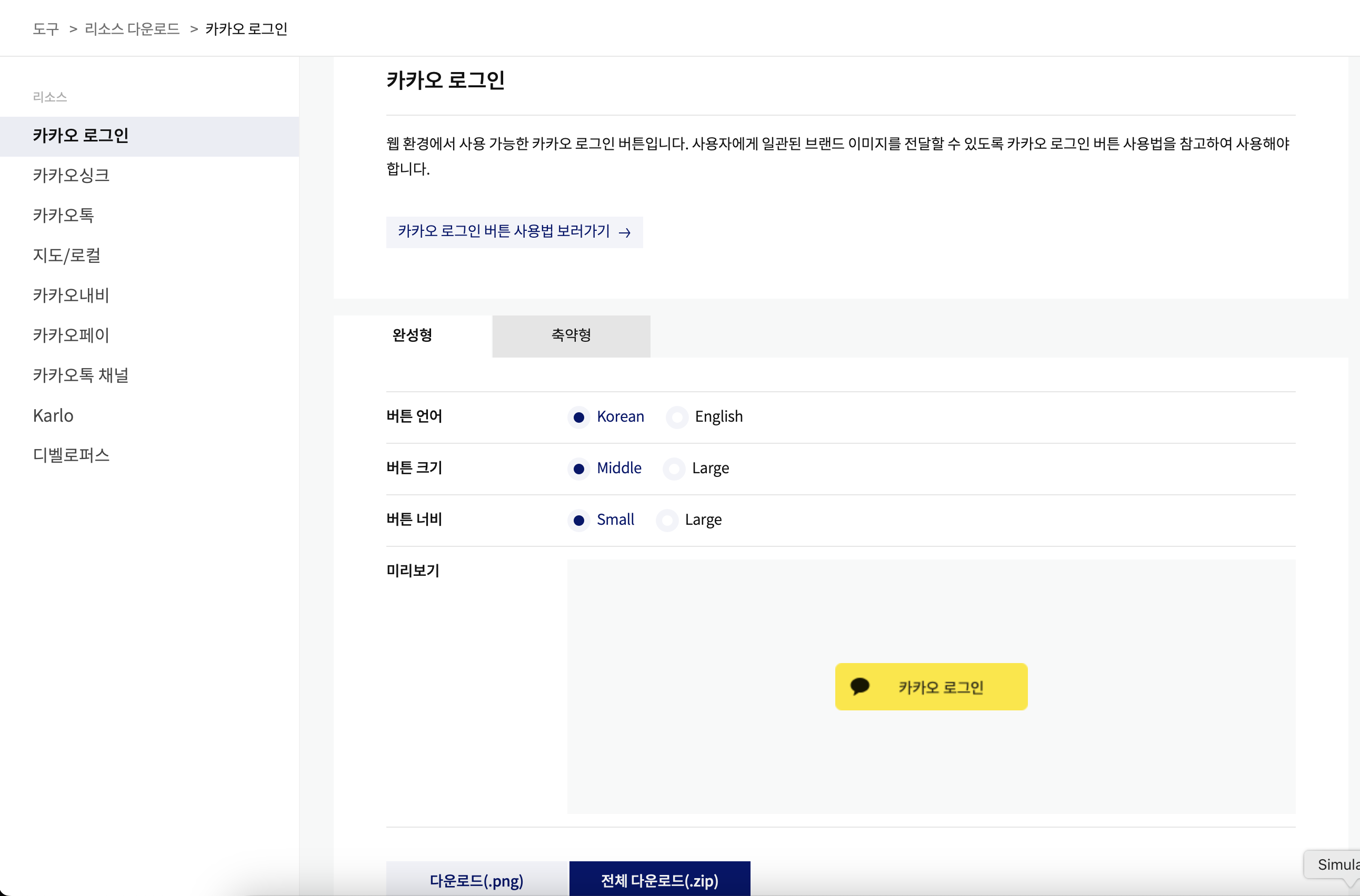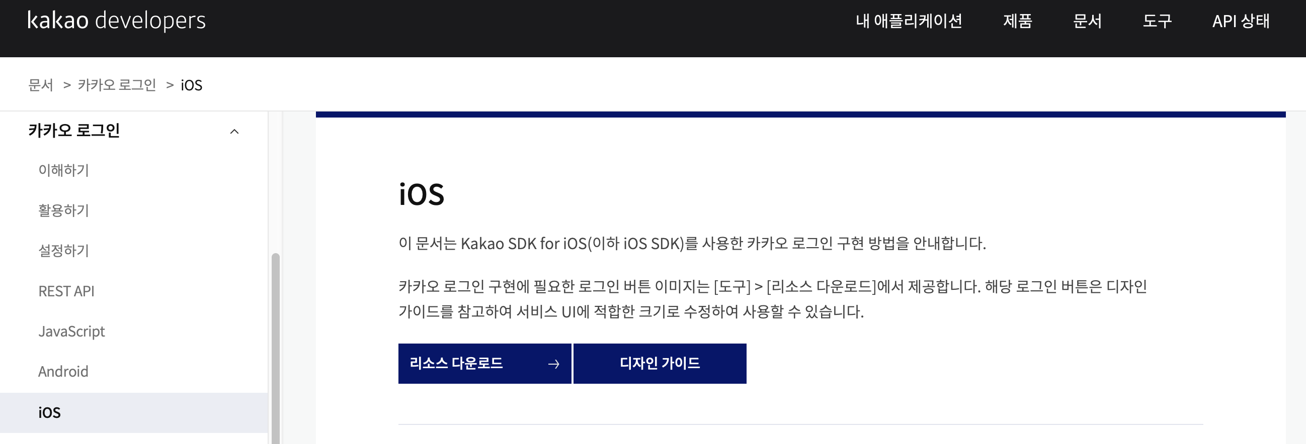 그리고 등록하고 나서 아래 로그인 관련 문서에서 카카오 로그인 관련 리소스 다운을 받는다. 친절한 카카오..