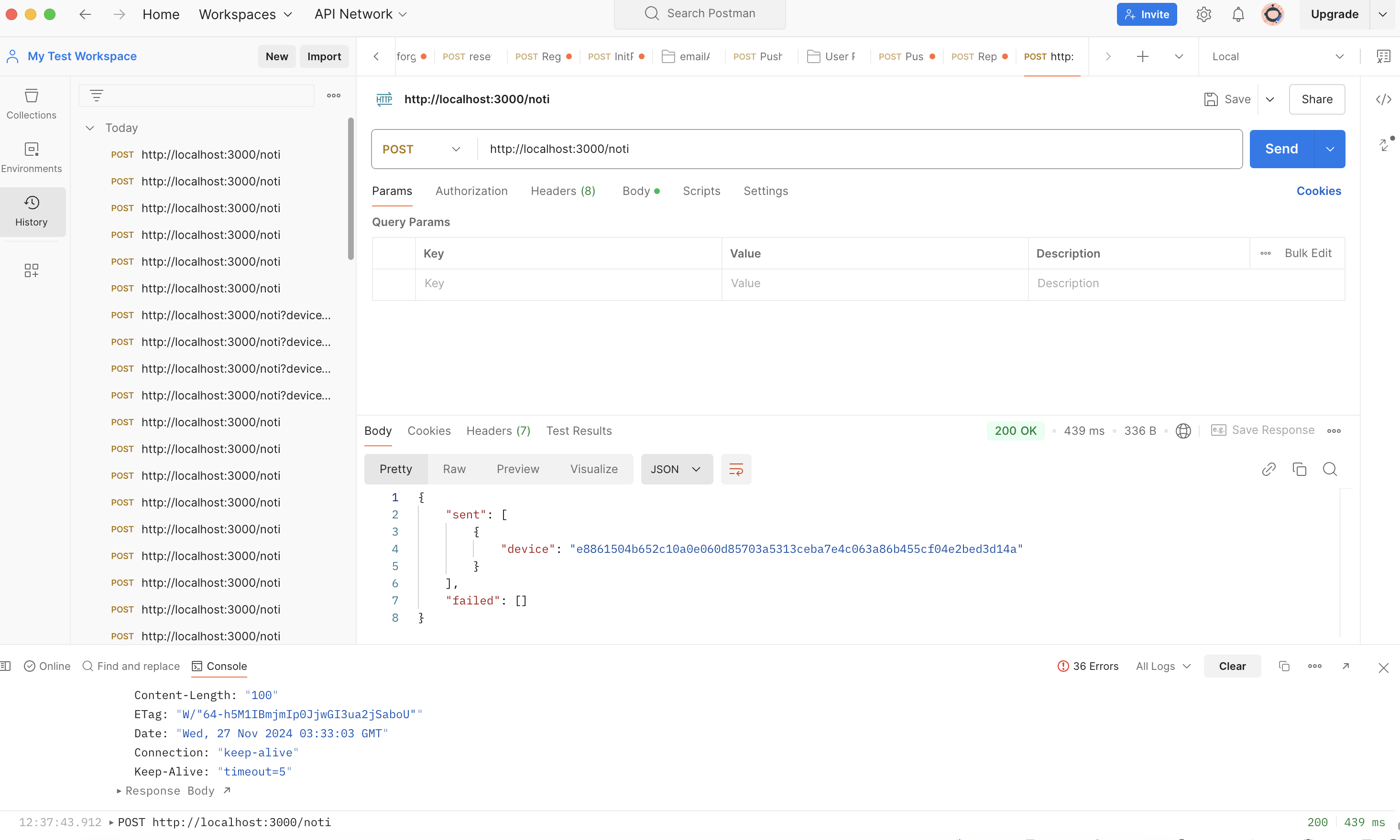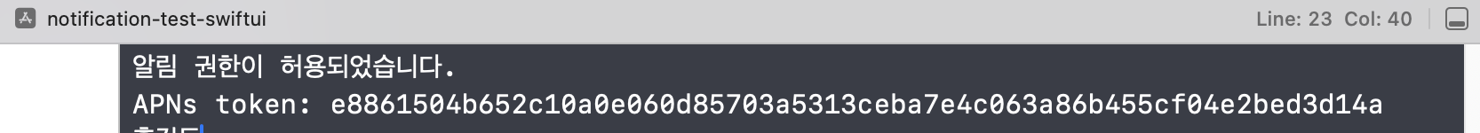 이제 앱을 빌드해주고, 터미널창에 나온 APNs 토큰을 복사해서 Postman에 넣어준다.