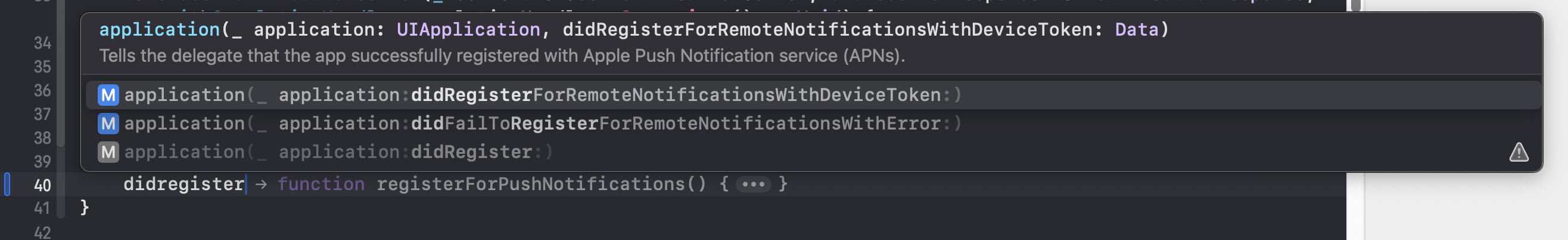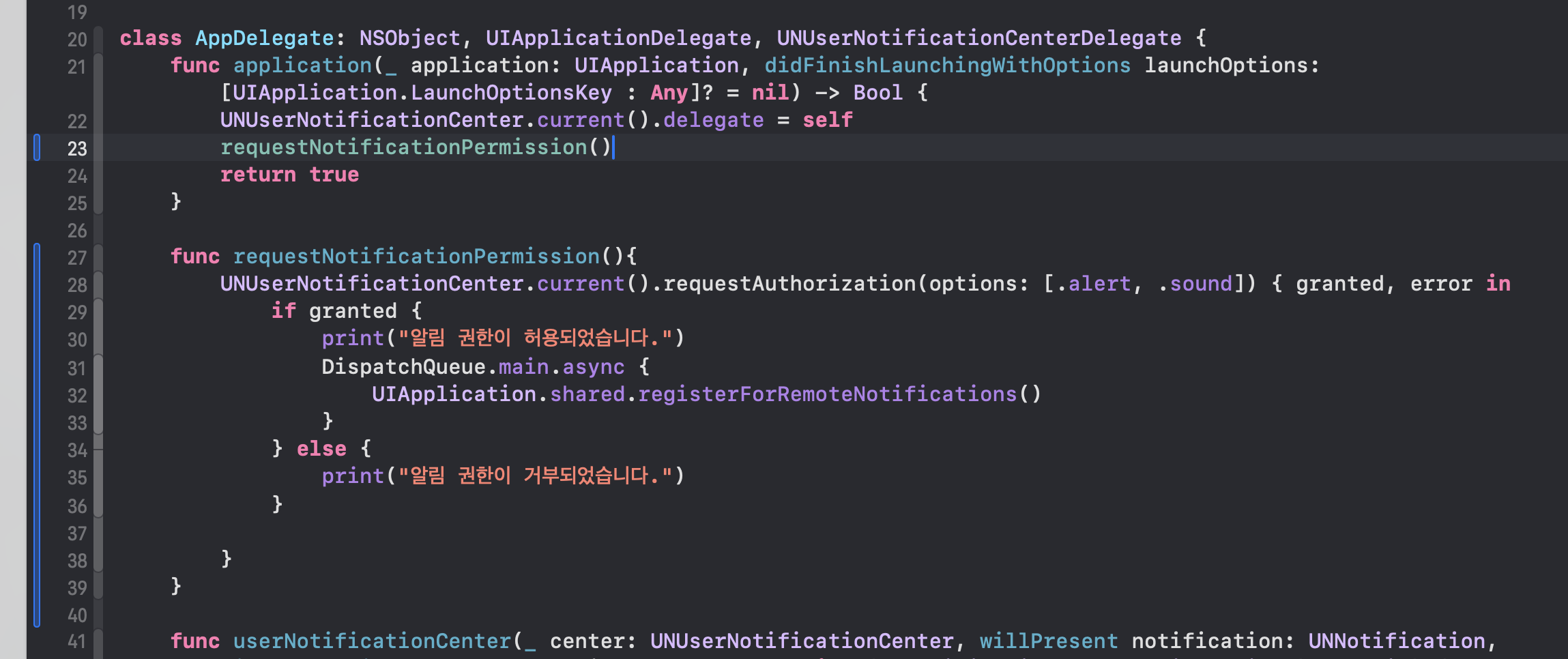 그리고 이렇게 함수로 따로 빼줬으니, didFinishLaunchingWithOptions 에서는 requestNotificationPermission() 메서드를 호출해주어야 한다. (line 23)