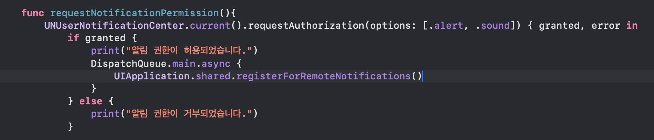 그리고 역시나 똑같이 granted 조건 실행문에는 DispatchQueue로 푸쉬 알림을 실행해준다.