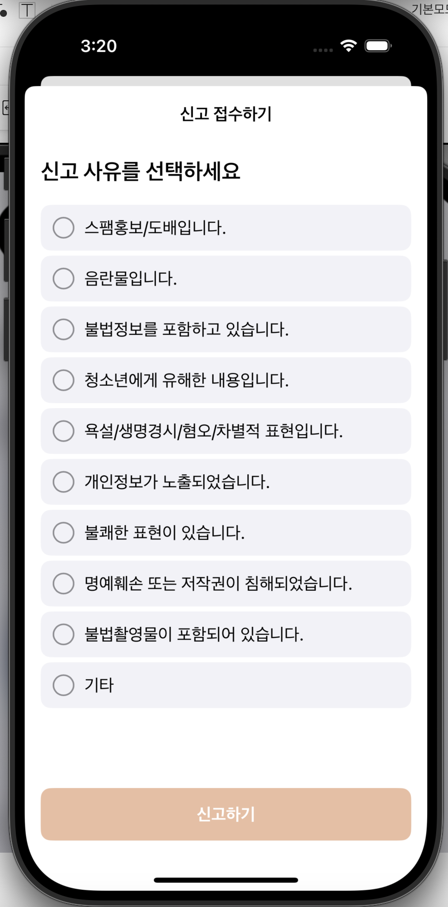 사진을 3d 터치로 눌러서 신고하기 버튼을 누른다고 할 때 나타나는 바로 여기다. 내 앱은