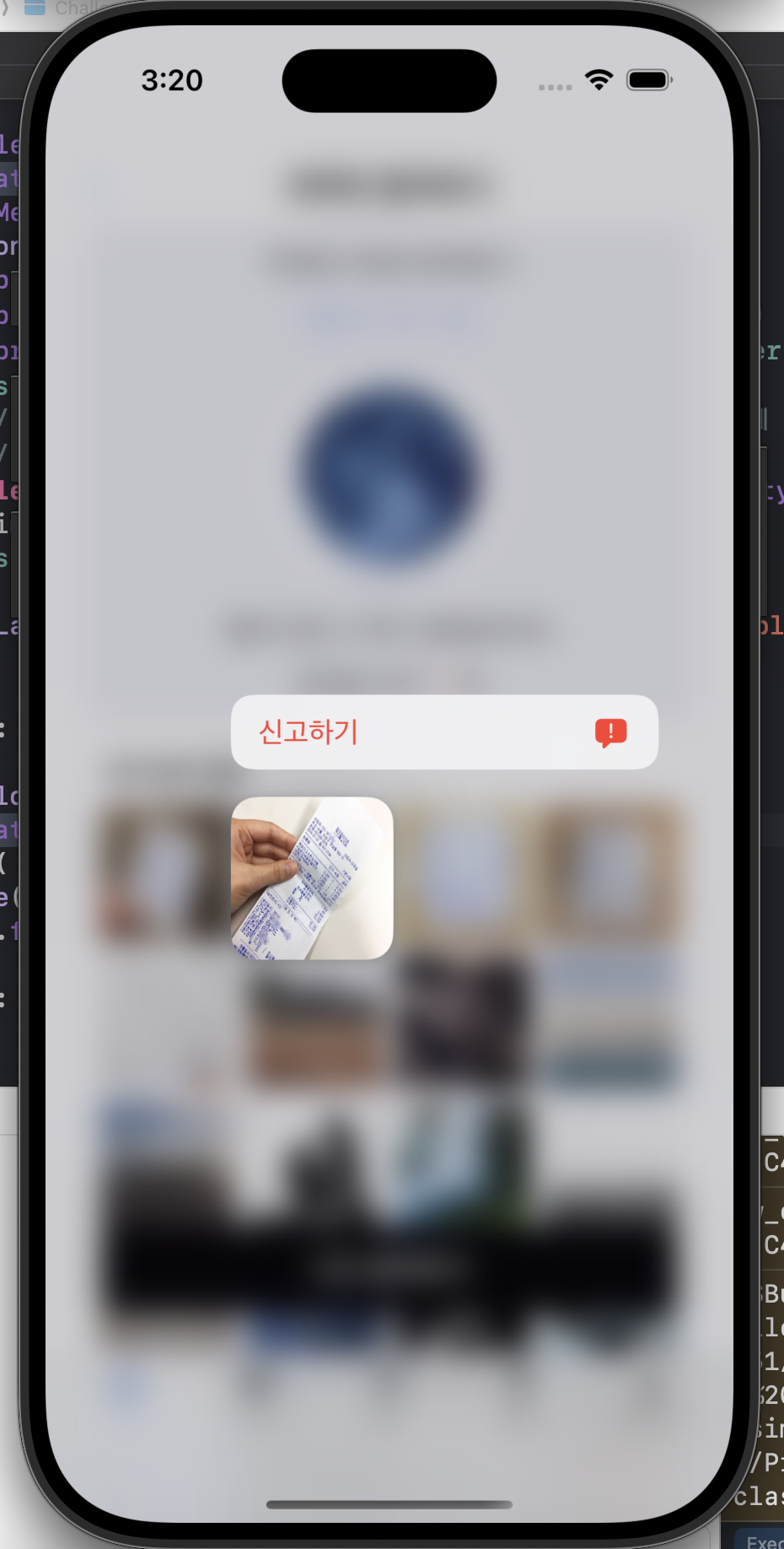 현재 ChallengeImagesGrid.swift에서 '신고하기'를 누르면 아래와 같이 바로 접수 화면으로 넘어가야하는데, 로딩이 오래걸리는지 뭔지 흰 화면만 뜨는것이다.
