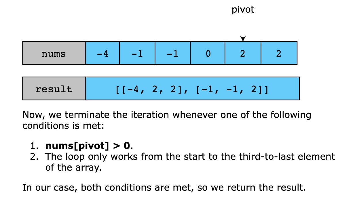 그래서 만약에 합이 너무 크면 right 포인터를 왼쪽으로, 작으면 left 포인터를 오른쪽으로 옮기면서 하면 되고, 만약 합이 0이라면 triplet을 result에다가 담으면 된다.