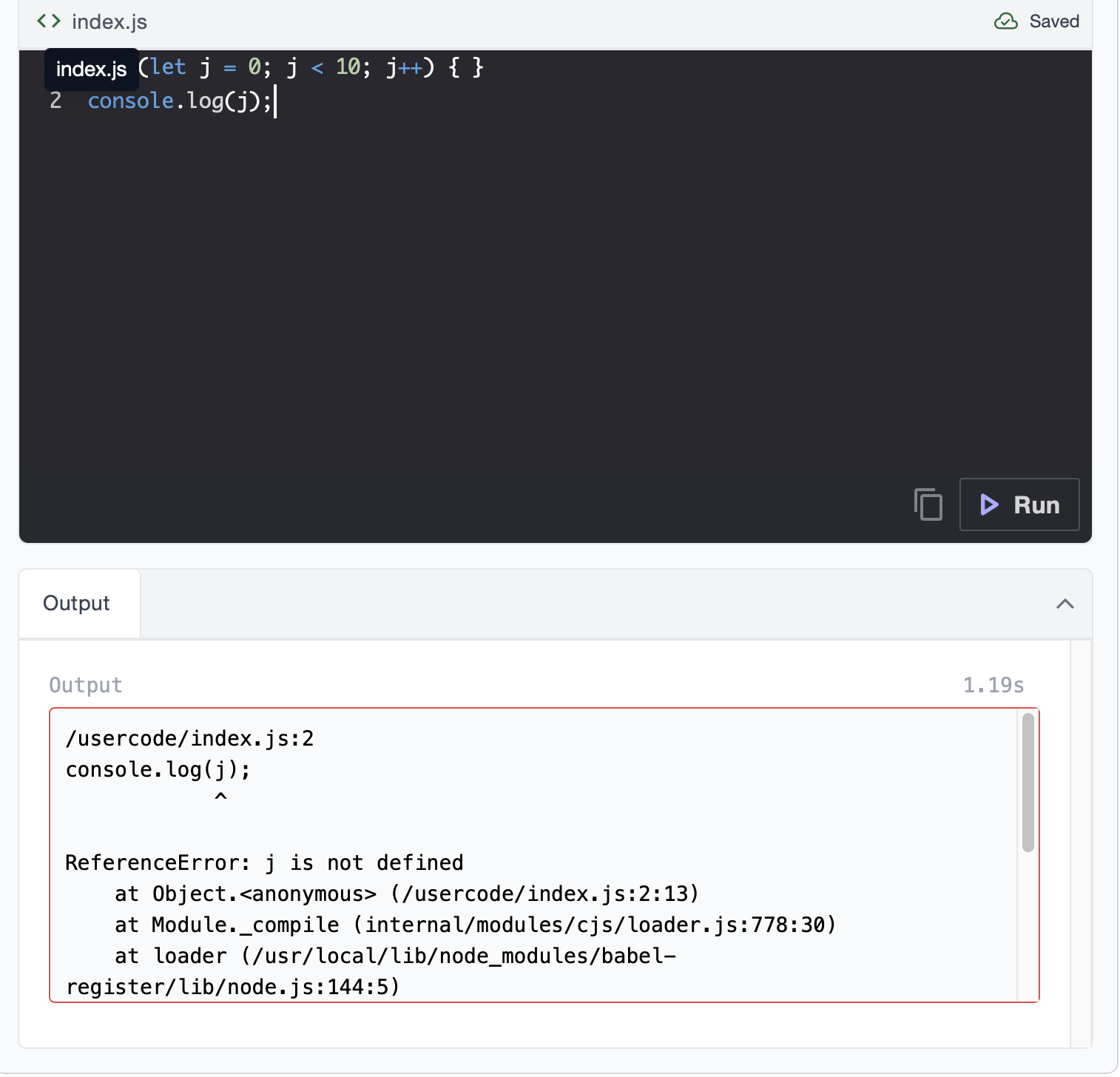 그렇기 때문에 아래와 같이 루프 안에서만 j가 존재하기 때문에, 출력을 하려고 하면 오류가 나는 것이다.