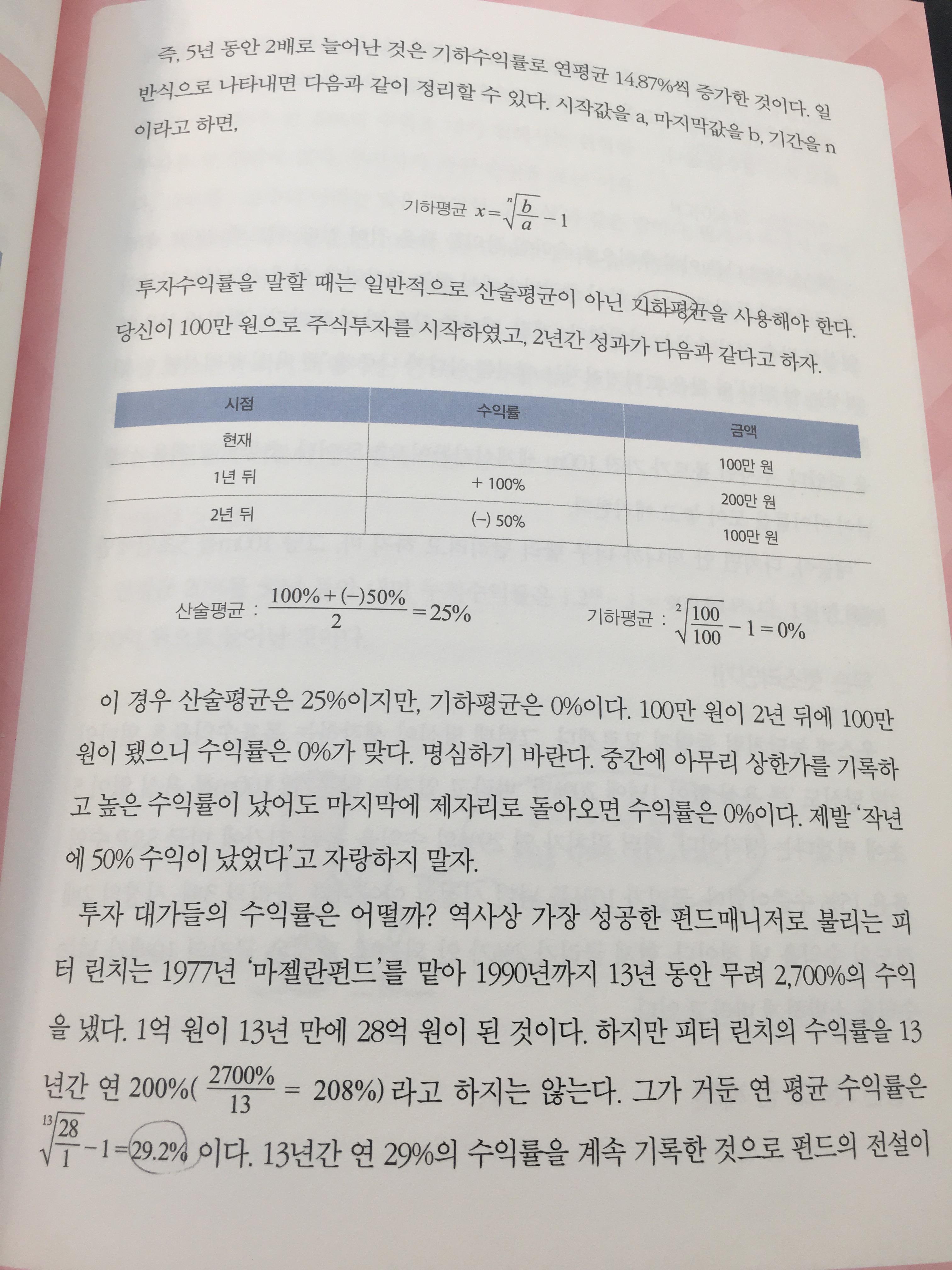 투자수익률은 산술평균이 아닌 기하평균으로 계산해야한다. 같은 비율로 이익과 손실을 반복하면 비율이 높을수록 손해다. 10%손실을 회복하기 위해서는 11% 의 수익이면 되지만, 50% 손실을 회복하기 위해서는 100% 수익이 나야 한다.
