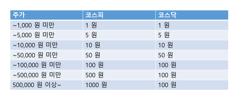 주가가 얼마냐에 따라 호가 단위가 달라진다. 호가 단위는 유가증권시장과 코스닥 시장에서 또 차이가 난다.