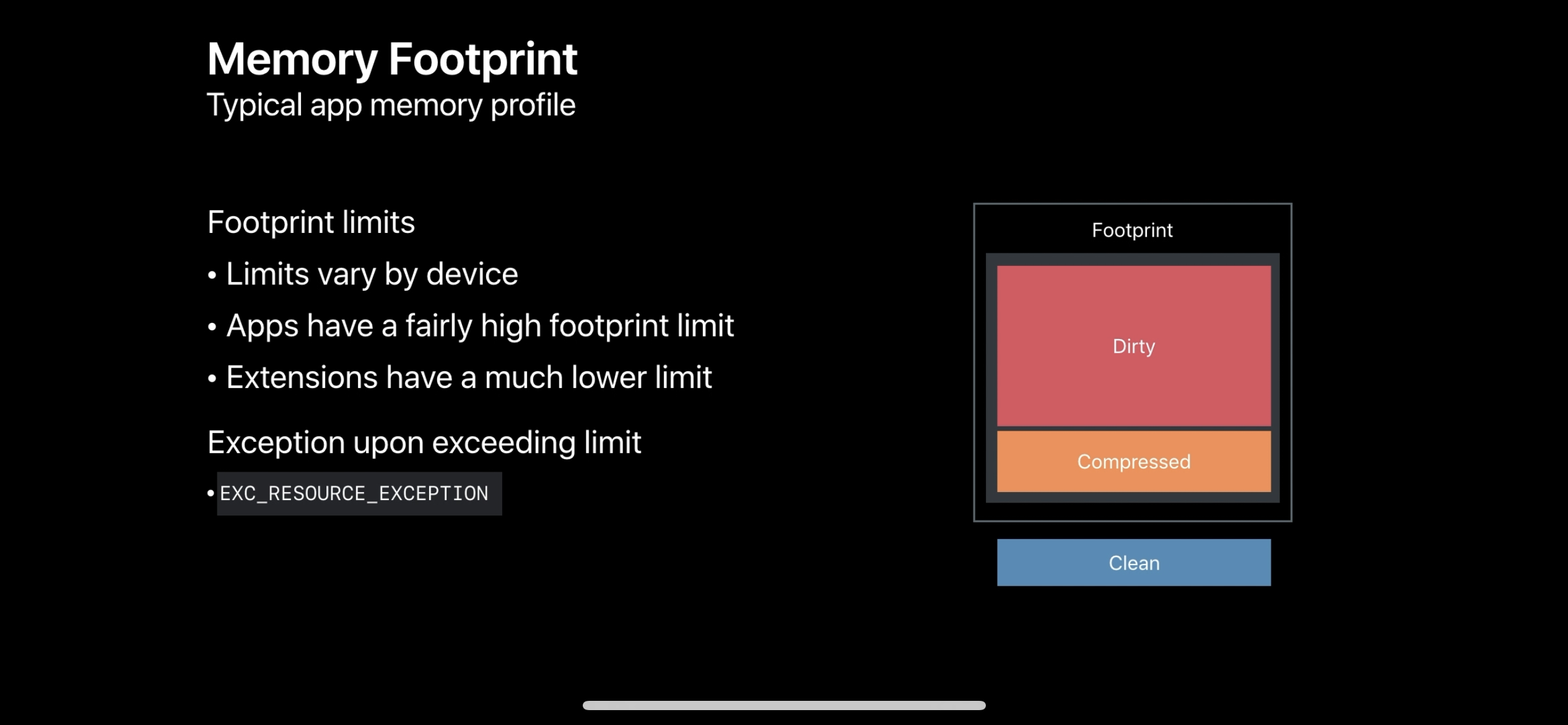 메모리의 footprint를 추적할 때는 Dirty, Compressed만 포함된다. 우리가 footprint를 프로파일링하는것은 이제 다른 엔지니어가 설명해주신다.
